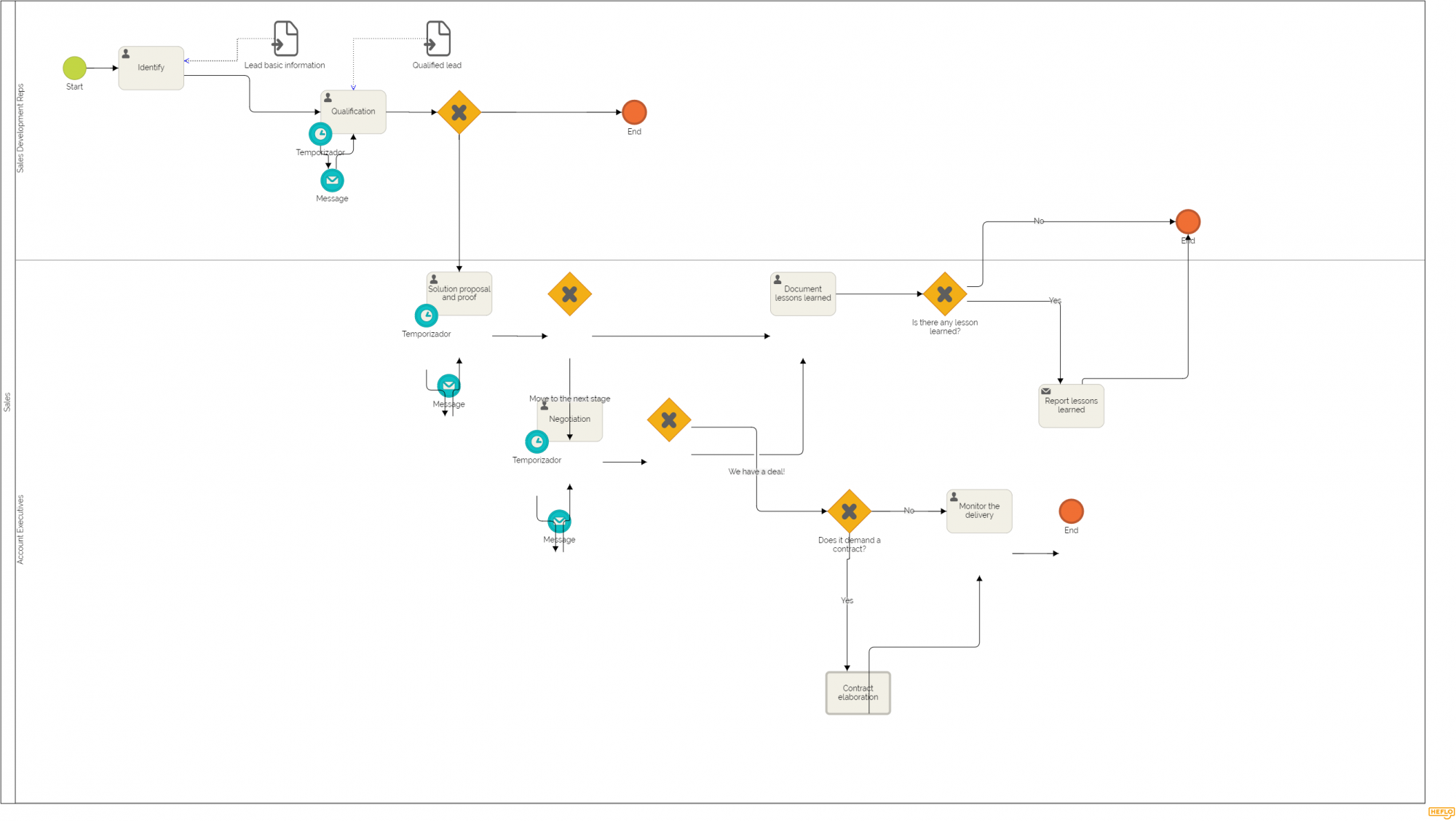 销售流程的BPMN可能就会简单许多,仅使用两条泳道便可表示:销售开发支持和客户销售人员,该BPMN示例图遵循4个传统销售步骤: